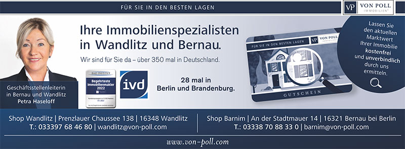 Petra Haseloff ist geprüfte freie Sachverständige für Immobilienbewertung, verfügt über viel Erfahrung in der Branche und ist vor Ort bestens vernetzt. Sie und ihr Team stehen in den Shops in Wandlitz und Bernau Interessenten und Eigentümern für eine unverbindliche Beratung jederzeit zur Verfügung und bieten eine kostenfreie sowie unverbindliche Marktpreiseinschätzung inklusive anschließender Ergebnisbesprechung an. Wer dann den Verkauf tatsächlich in die Realität umsetzen möchte, den betreuen Petra Haseloff und ihr Team während des gesamten Vermittlungsprozesses bis zum erfolgreichen Vertragsabschluss.